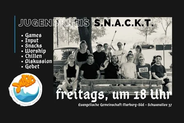 Zusammen mit der Ev. Gem. Marburg-Ortenberg bieten wir jeden Freitag einen Jugendkreis an: S.N.A.C.K.T. Das ist Dein Ding!